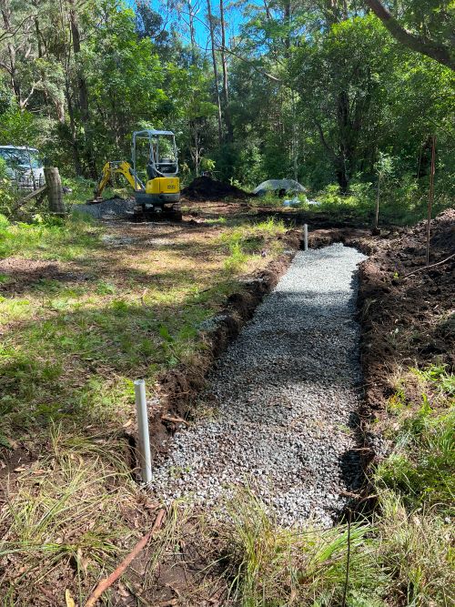 As groundwater accumulates in the surrounding soil, it naturally flows into the gravel trench, enters the perforated pipe, and is redirected to a designated safe discharge area. This system operates efficiently below ground level and does not rely on visible grates or channels, making it particularly advantageous in clay-heavy soils, which are common in Wollongong and the broader Illawarra region.