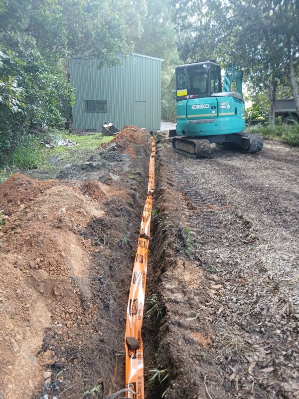 Running underground sub-mains involves the installation of mechanically protected cabling through conduit, which must be trenched at the correct depth and backfilled appropriately. On rural properties, this often necessitates collaboration with an earthworks contractor for the trenching process. The electrical connections at both ends, including those at the main switchboard and the shed sub-board, must be executed by licensed electrical professionals. We manage the entire process, overseeing earthworks, so you only need to communicate with one point of contact instead of juggling multiple trades, making the project more streamlined and efficient for you.